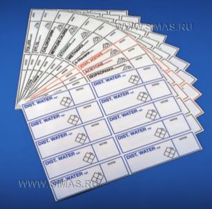 Описание: 11 типов прозрачных штампованных этикеток для промывалок, пластиковых или стеклянных бутылок с реактивами, согласно рекомендациям NFPA. Имеют номера, обозначающие степень риска, рекомендации по использованию и особые отметки, указываемые в каталогах реактивов.