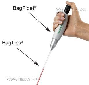 Описание: Полностью автоклавируемая пипетка БэгПипет фиксированного объема (0,1, 0,9 или 1 мл). Используется с одноразовыми стерильными и прочными длинными наконечниками БэгТипс для отбора жидкостей из пакетов, достаточной длины, чтобы достать до дна. При этом отсутствует риск забивания пипетки густыми или пастообразными продуктами.